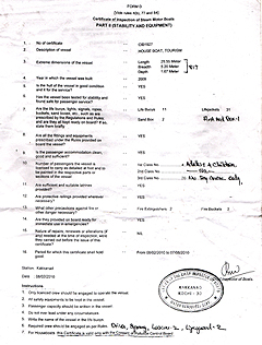 A-Form It is the License issue by the canal office, Alleppey to the houseboat under section 1098 Act VI. It includes:- 1) License No 2) Owners name & Address 3) houseboat building place, year 4) boat house width, length, depth 5) Total weight houseboat 6) Date of expiry Form D This certificate issued by the Chief Inspector of Boats, Ernakulam, Kochi-31 It is divided in two parts one is PART1- Machinery & second one is PART 2- Stability and Equipment. It includes:- Part 1 – Machinery 1) No of the certificate 2) owner name & address 3) Vessel name 4) residence place 5) year of built 6) Nature of fuel used 7) period of certificate 8) No of passengers Part 2 – Stability and Equipment 1) No of the certificate 2) Description of the vessel 3) vessel hull is good or not 4) how may life buoys, life Jacket, Lights, Ropes, Buckets, First aid box 5) Protection against fire 6) Nature of repair & Renewal 7) Certificate period Kerala State Pollution Control Board It is consent to operate house boating in alleppey, issued under water (Prevention & Control Pollution) Act 1974 & environment (protection) Act, 1986 Includes :- 1) Name & address of the establishment 2) occupier details 3) category 4) scale 5) capital investment 6) water consumption 7) Engine Type & No Important condition as follows 1) Maximum quantity of effluent discharged per day shall not exceed 500 liters/day 2) Service register shall be maintained for recording number of passengers utilized the houseboat for trip, date &duration of the trip 3) Use eco friendly bags and container (plates, glass) in the houseboat 4) Diesel generator set installed in the boat shall conform to environment protection 5) Annual inspection shall be conducted before the renewal of the statutory license |
